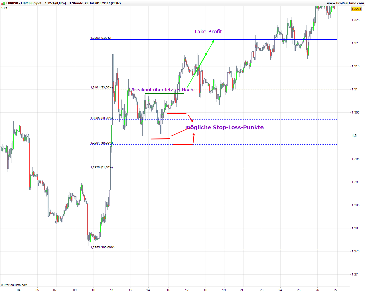 Sind die Retracements sauber eingezeichnet worden, können Unterstützungszonen schon vorher bestimmt werden und somit sichere Signale liefern. Eine Vorgehensweise wäre z. B. auf ein Anlaufen des 38,20%-igen Fibonacci-Retracements zu warten. Diese Marke wird sehr oft getriggert und bietet hervorragende Chancen. Anschließend kann sich mit einem Breakout über das letzte sekundäre Hoch in Trendrichtung positioniert werden. Als Stop-Loss stehen je nach Situation das letzte Verlaufstief oder das 50%-ige Fibonacci-Level bereit. Als Take-Profit kann der Höchstkurs der Bewegung dienen oder auch dynamisch angepasst werden.