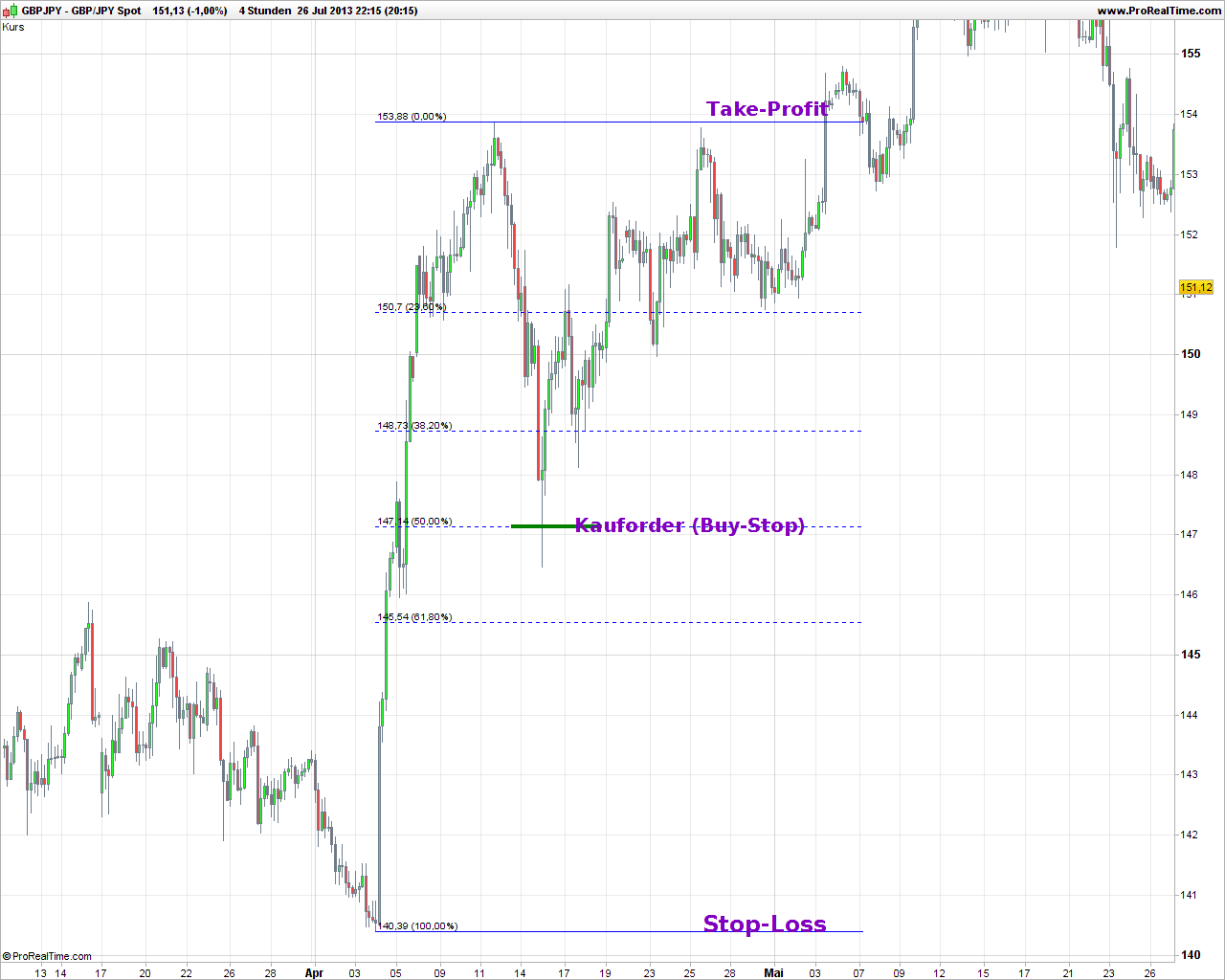 Eine weitere bewährte Handelsmethode ist nach einer impulsiven Aufwärtsbewegung auf ein Anlaufen des 50%-igen Fibonacci-Retracements zu warten. An dieser Stelle wird eine Kauforder platziert. Als Take-Profit wird der Höchstkurs der Aufwärtsbewegung bestimmt. Als Stop-Loss gilt der Ausgangspunkt der Bewegung. Die gleiche Vorgehensweise eignet sich natürlich auch für einen Abwärtstrend.