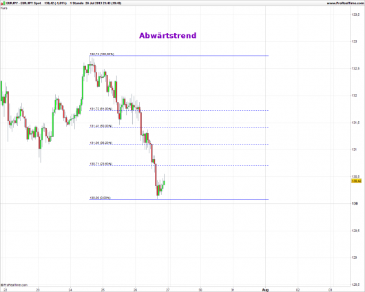 Wie zu erkennen ist, legt der Kurs an den Retracements Zwischenpausen ein, welche sich als Unterstützungen erweisen und somit dem Kurs immer wieder Halt geben.