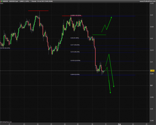 Der Blick in den Tageschart bestätigt momentan zwar die bärische Sichtweise, dennoch sollte auf klare Signale geachtet werden. Am Mittwoch steht die Schätzung des US-BIP für das zweite Quartal und die Zusammenkunft von (Helikopter-)Ben Bernanke mit der FOMC auf dem Plan. Am letzten Handelstag der Woche rücken dann, wie jeden ersten Freitag im Monat, die US-Arbeitsmarkdaten in den Vordergrund. All dies kann zu erhöhter Volatilität führen.