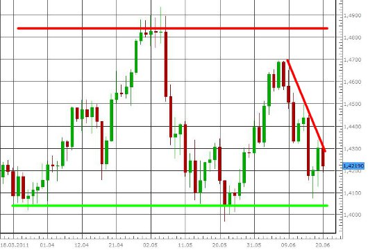 Das Einzige, was man erkennen kann, sind eine Unterstützungslinie bei 1,4050 und ein Widerstand bei 1,4830. Zwischen diesen Marken ging es in den letzten 3 Monaten munter auf und ab. Daher lohnt sich wieder ein Blick auf den kurzfristigen Chart der letzten 5 Tage.